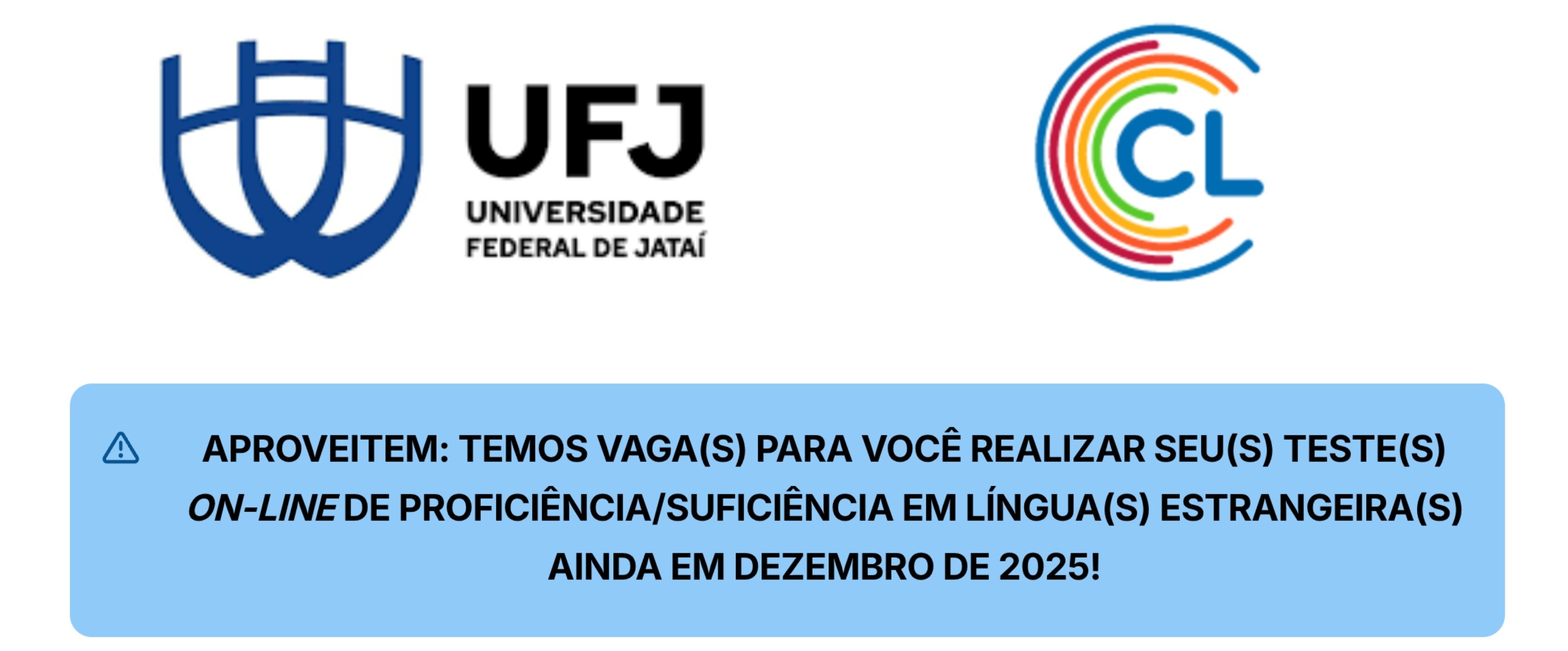 Vagas remanescentes (dezembro de 2025) : testes on-line de proficiência e suficiência em línguas estrangeiras (espanhol, francês, inglês, italiano) Entrem em contato com o e-mail: centrodelinguas@ufj.edu.br. Categorias: Notícias Noticias Listar Todas Voltar